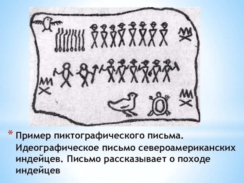 Слайд 23Пример пиктографического письма. Идеографическое письмо североамериканских индейцев. Письмо рассказывает о походе