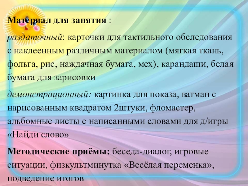 Методические приёмы: беседа-диалог, игровые ситуации, физкультминутка «Весёлая переменка», подведение итогов