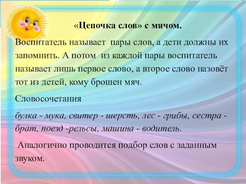 запомнить. А потом из каждой пары воспитатель называет лишь первое слово, а второе слово назовёт тот из детей, кому брошен мяч.