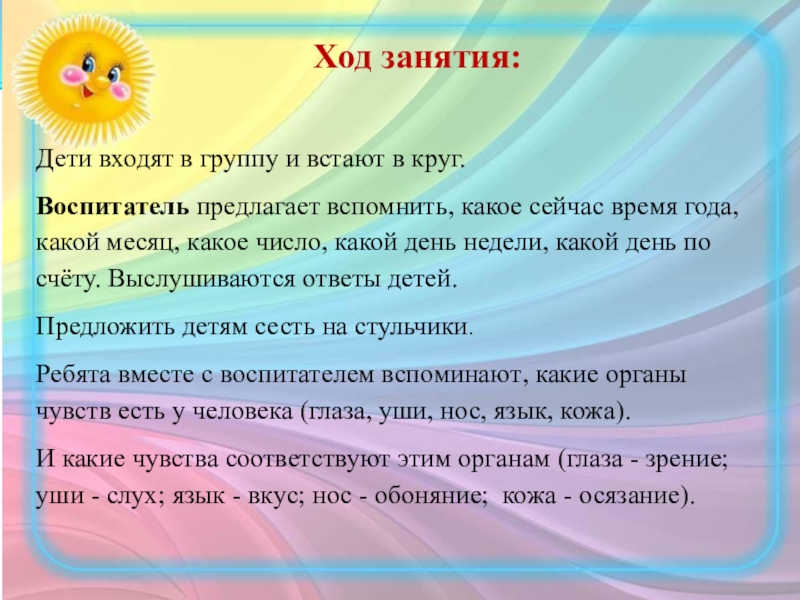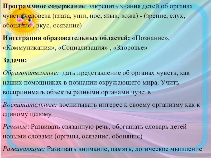 Образовательные: дать представление об органах чувств, как наших помощниках в познании окружающего мира. Учить воспринимать объекты разными органами чувств