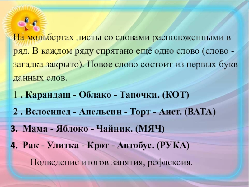 На мольбертах листы со словами расположенными в ряд. В каждом ряду