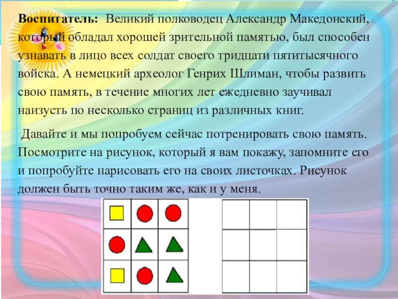 Слайд 6Воспитатель: Великий полководец Александр Македонский, который обладал хорошей зрительной памятью, был