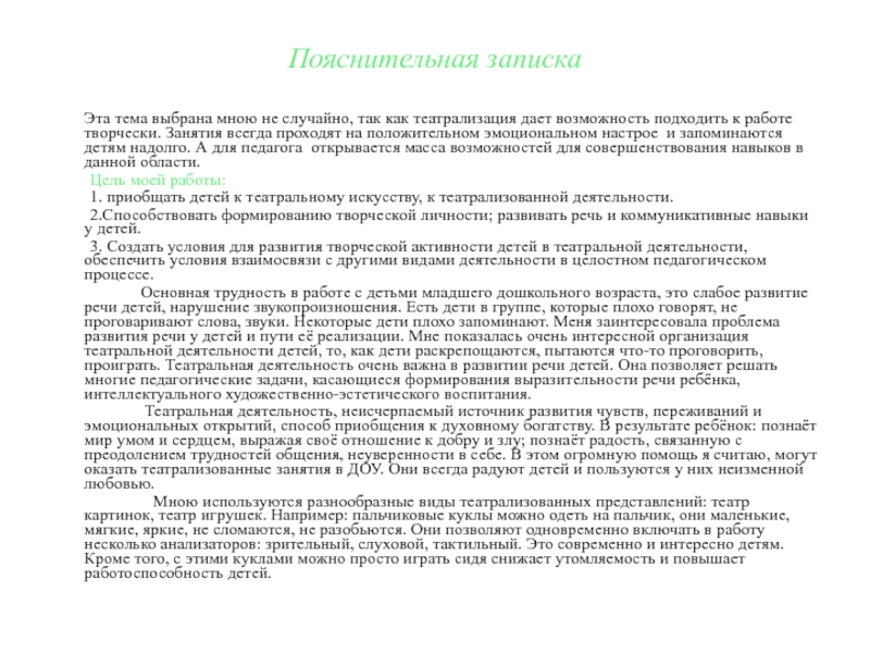 Театральная деятельность, неисчерпаемый источник развития чувств, переживаний и эмоциональных открытий, способ приобщения к духовному богатству. В результате ребёнок: познаёт мир умом и сердцем, выражая своё отношение к добру и злу; познаёт радость, связанную с преодолением трудностей общения, неуверенности в себе. В этом огромную помощь я считаю, могут оказать театрализованные занятия в ДОУ. Они всегда радуют детей и пользуются у них неизменной любовью.