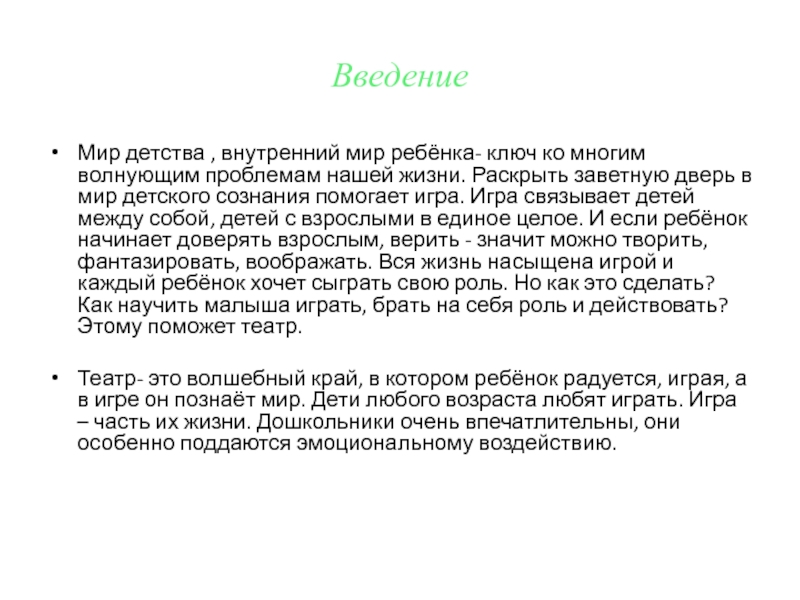 Театр- это волшебный край, в котором ребёнок радуется, играя, а в игре он познаёт мир. Дети любого возраста любят играть. Игра – часть их жизни. Дошкольники очень впечатлительны, они особенно поддаются эмоциональному воздействию.