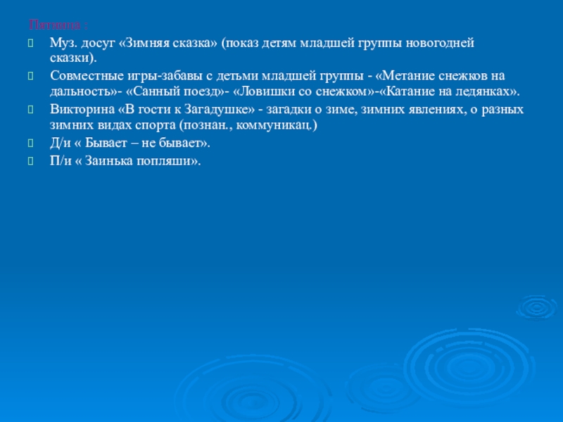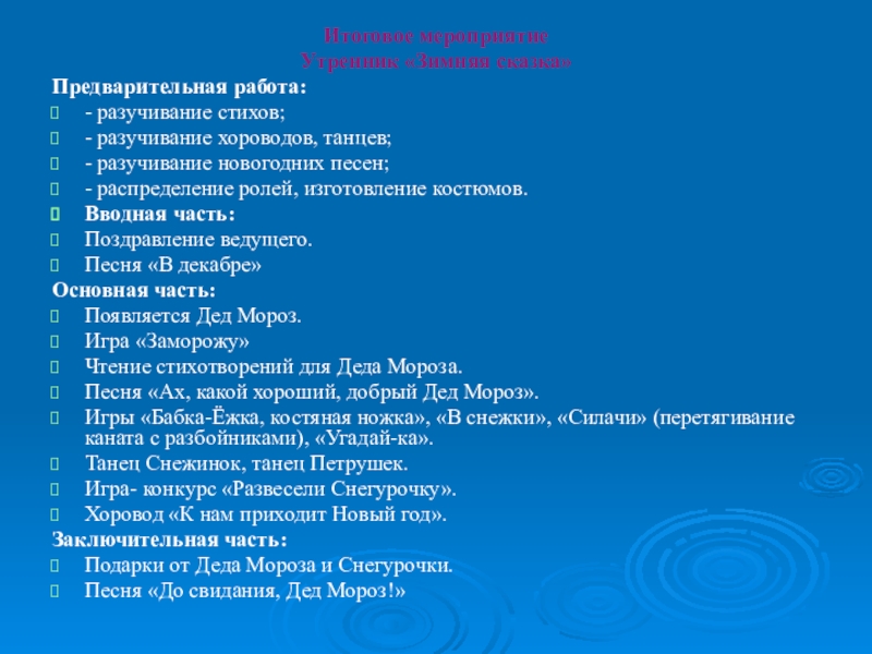 Муз. досуг «Зимняя сказка» (показ детям младшей группы новогодней сказки).