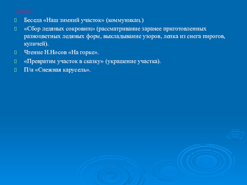 разноцветных ледяных форм, выкладывание узоров, лепка из снега пирогов, куличей).