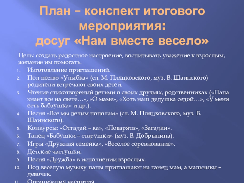 Цель: создать радостное настроение, воспитывать уважение к взрослым, желание им помогать.