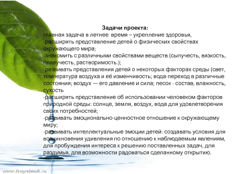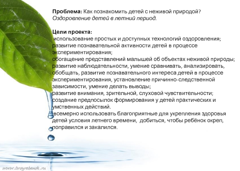 всемерно использовать благоприятные для укрепления здоровья детей условия летнего времени, добиться, чтобы ребёнок окреп, поправился и закалился.