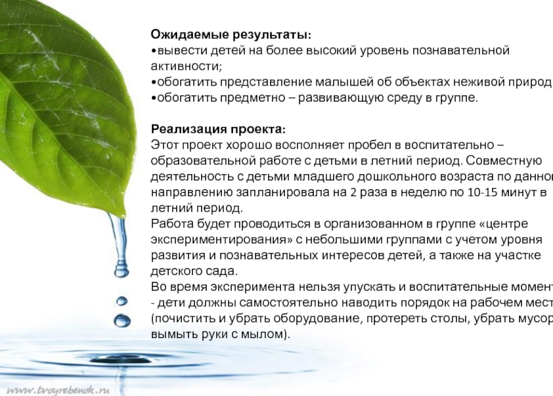 Работа будет проводиться в организованном в группе «центре экспериментирования» с небольшими группами с учетом уровня развития и познавательных интересов детей, а также на участке детского сада.