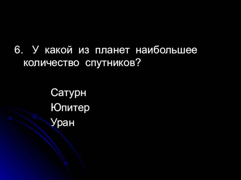 6.  У какой из планет наибольшее количество спутников?			Сатурн			Юпитер			Уран