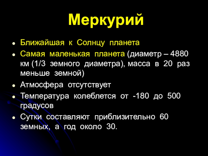 Меркурий Ближайшая к Солнцу планетаСамая маленькая планета (диаметр – 4880 км (1/3 земного диаметра), масса в 20 раз меньше земной)Атмосфера отсутствуетТемпература колеблется от -180 до 500 градусовСутки составляют приблизительно 60 земных, а год около 30.