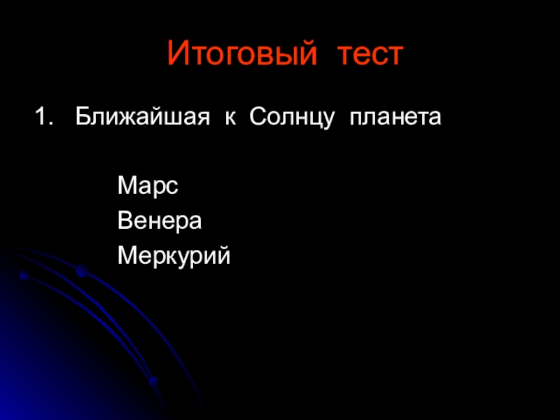 Итоговый тест1.  Ближайшая к Солнцу планета 			Марс			Венера			Меркурий