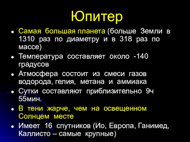 Юпитер Самая большая планета (больше Земли в 1310 раз по диаметру и в 318 раз по массе)Температура