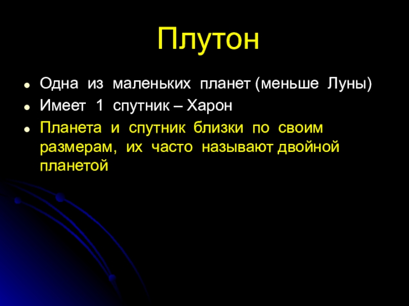 Плутон Одна из маленьких планет (меньше Луны)Имеет 1 спутник – ХаронПланета и спутник близки по своим размерам,