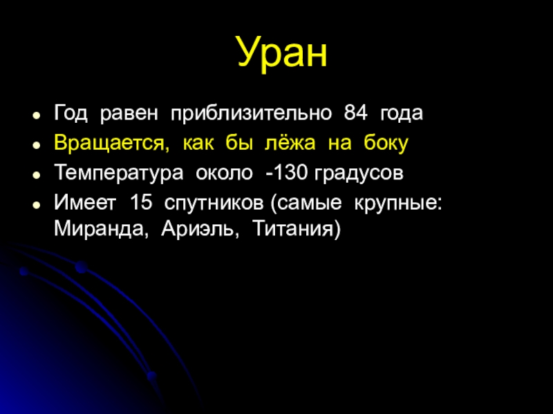 Уран Год равен приблизительно 84 годаВращается, как бы лёжа на бокуТемпература около -130 градусовИмеет 15 спутников (самые