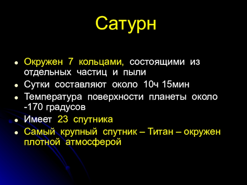 СатурнОкружен 7 кольцами, состоящими из отдельных частиц и пылиСутки составляют около 10ч 15минТемпература поверхности планеты около -170