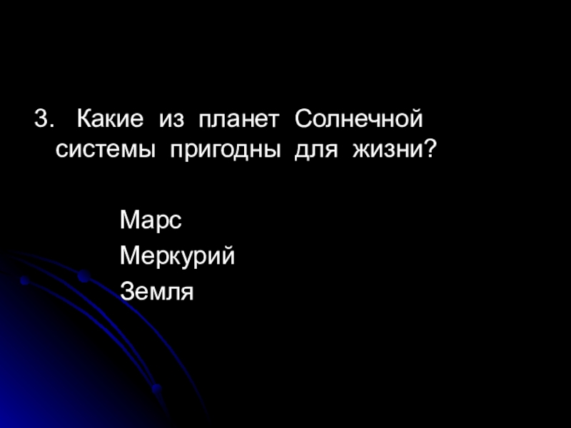 3.  Какие из планет Солнечной системы пригодны для жизни?						Марс			Меркурий			Земля