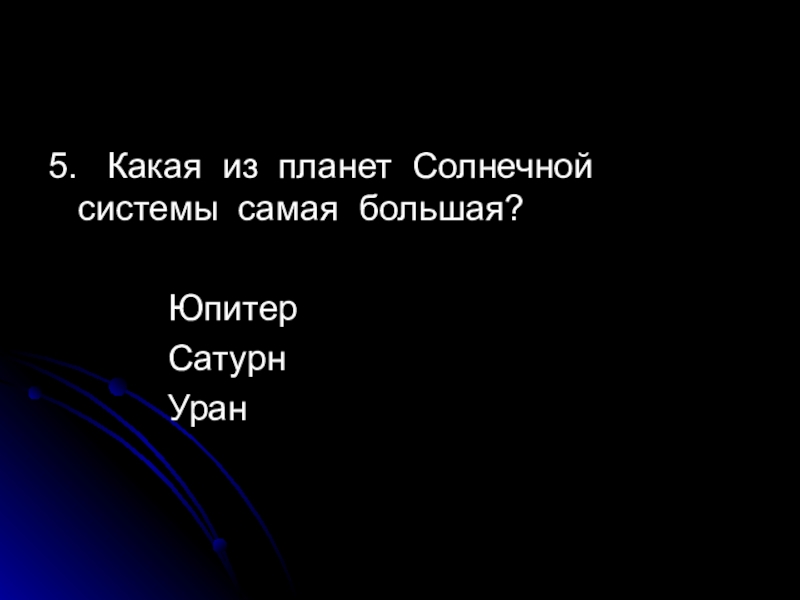 5.  Какая из планет Солнечной системы самая большая?			Юпитер			Сатурн			Уран