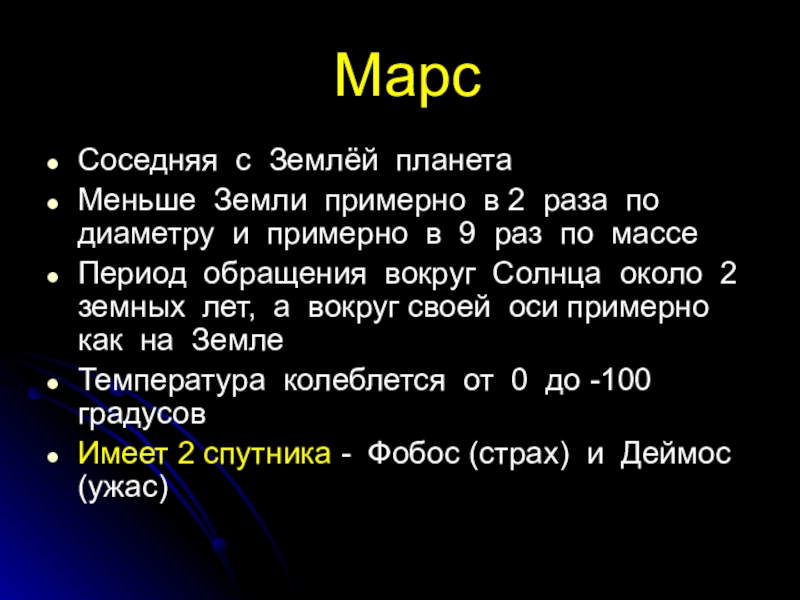 Марс Соседняя с Землёй планетаМеньше Земли примерно в 2 раза по диаметру и примерно в 9 раз