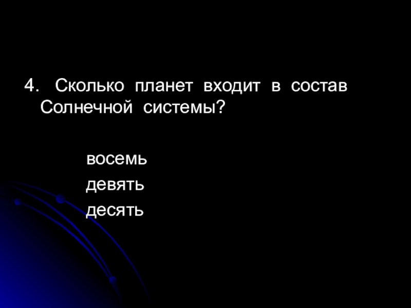 4.  Сколько планет входит в состав Солнечной системы?			восемь			девять			десять