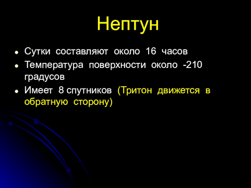 Нептун Сутки составляют около 16 часовТемпература поверхности около -210 градусовИмеет 8 спутников (Тритон движется в обратную сторону)