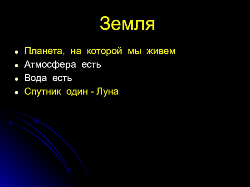 Земля Планета, на которой мы живемАтмосфера естьВода естьСпутник один - Луна