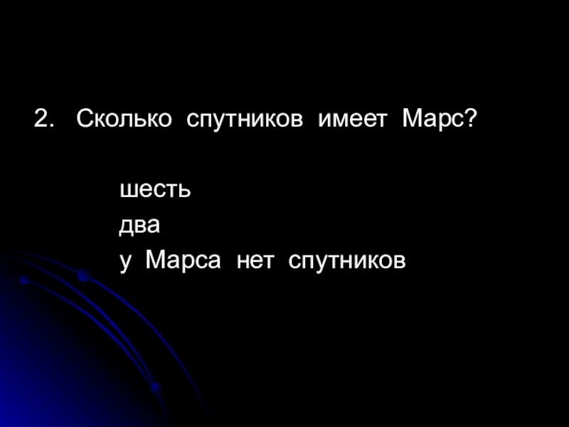2.  Сколько спутников имеет Марс?					шесть			два			у Марса нет спутников