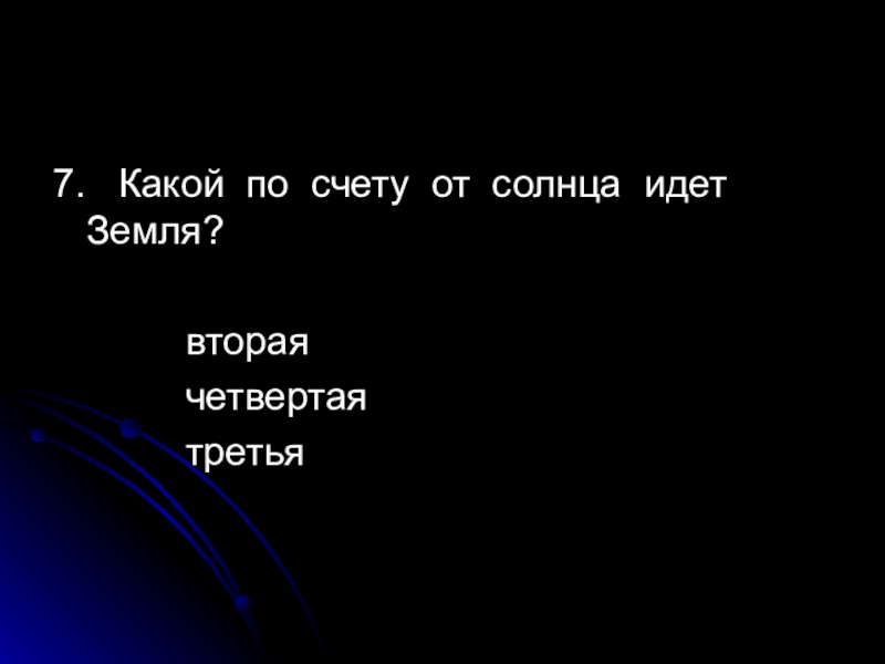 7.  Какой по счету от солнца идет Земля?			вторая			четвертая			третья