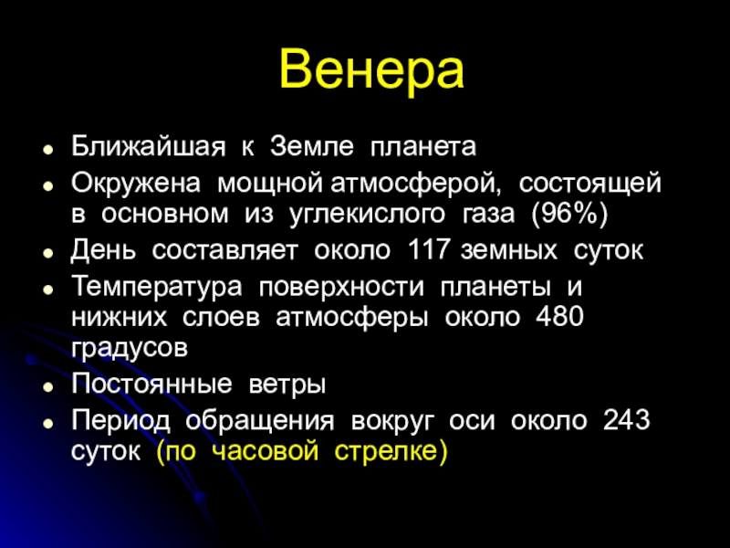 Венера Ближайшая к Земле планетаОкружена мощной атмосферой, состоящей в основном из углекислого газа (96%)День составляет около 117