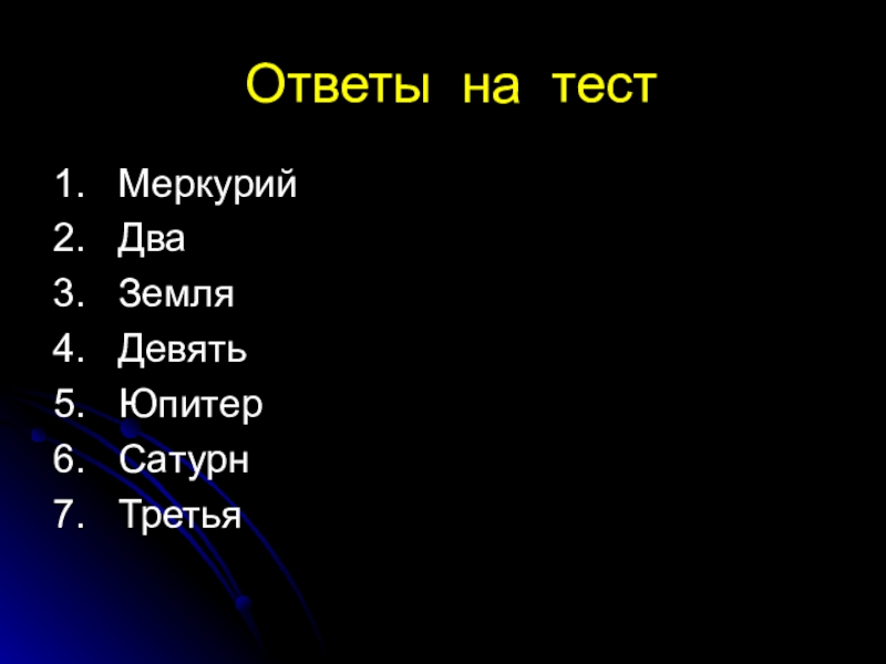 Ответы на тест1.  Меркурий2.  Два3.  Земля4.  Девять5.  Юпитер6.  Сатурн7.  Третья