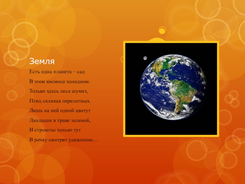 ЗемляЕсть одна планета – садВ этом космосе холодном.Только здесь леса шумят,Птиц скликая перелетных.Лишь на ней одной цветутЛандыши