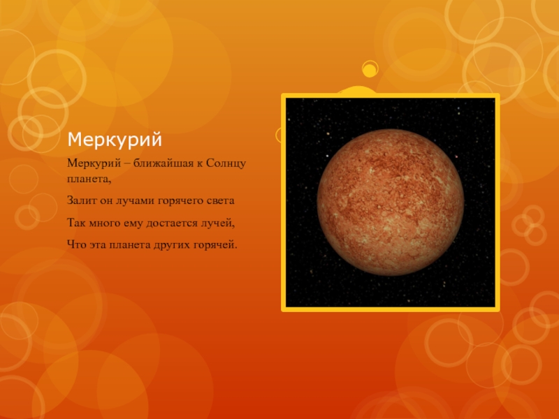 Меркурий Меркурий – ближайшая к Солнцу планета,Залит он лучами горячего светаТак много ему достается лучей,Что эта планета