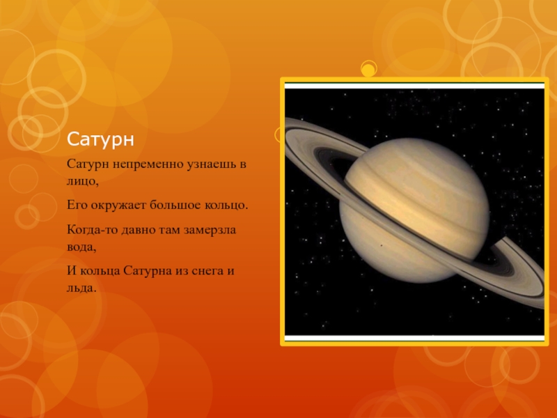 СатурнСатурн непременно узнаешь в лицо,Его окружает большое кольцо.Когда-то давно там замерзла вода,И кольца Сатурна из снега и
