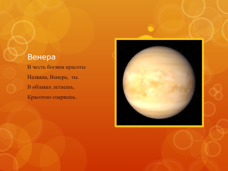 ВенераВ честь богини красотыНазвана, Венера,  ты.В облаках летаешь,Красотою озаряешь.