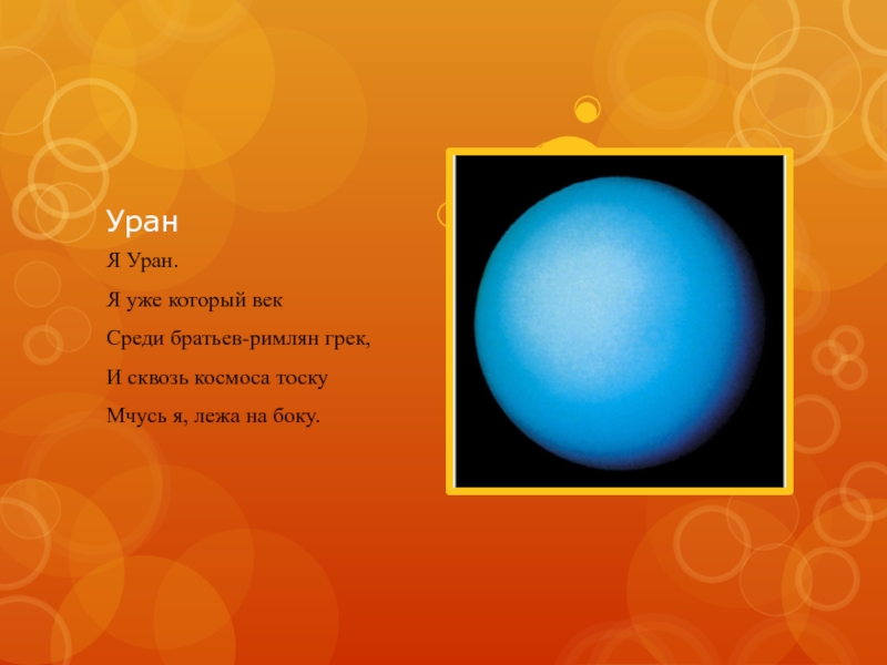 УранЯ Уран.Я уже который векСреди братьев-римлян грек,И сквозь космоса тоскуМчусь я, лежа на боку.
