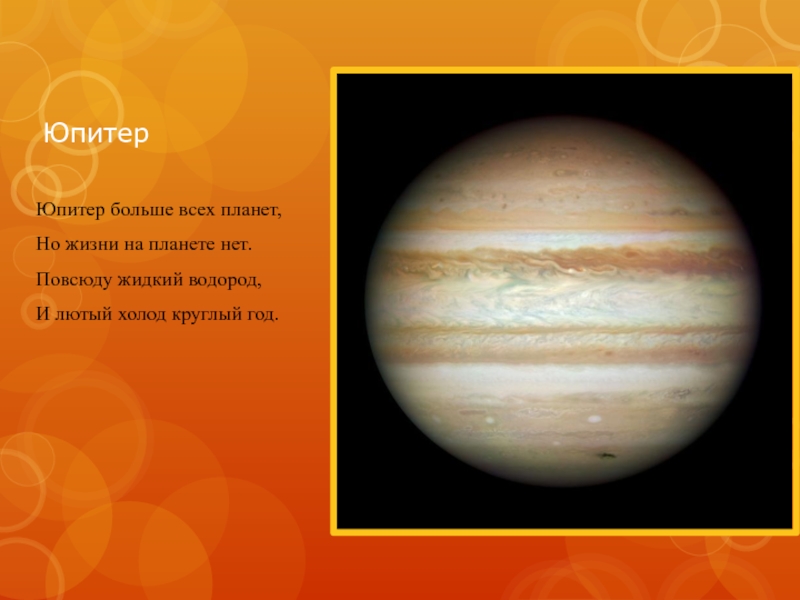 ЮпитерЮпитер больше всех планет,Но жизни на планете нет.Повсюду жидкий водород,И лютый холод круглый год.