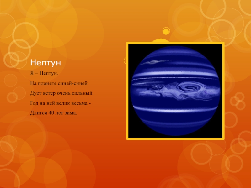 НептунЯ – Нептун.На планете синей-синейДует ветер очень сильный.Год на ней велик весьма -Длится 40 лет зима.