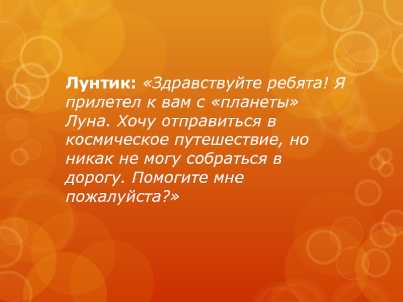 Лунтик: «Здравствуйте ребята! Я прилетел к вам с «планеты» Луна. Хочу отправиться в космическое путешествие, но никак не могу собраться в дорогу. Помогите мне пожалуйста?»