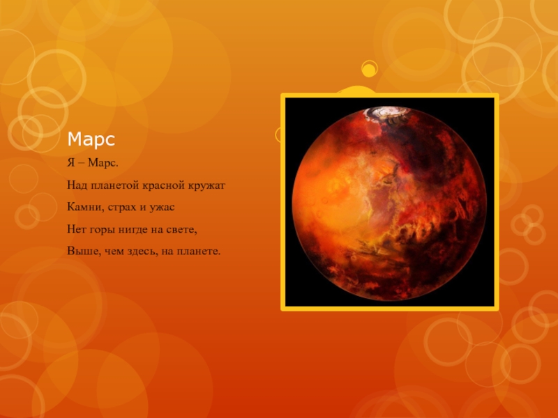 МарсЯ – Марс.Над планетой красной кружатКамни, страх и ужасНет горы нигде на свете,Выше, чем здесь, на планете.