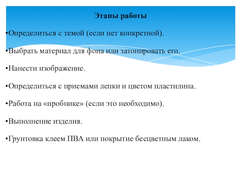 Этапы работыОпределиться с темой (если нет конкретной).Выбрать материал для фона или затонировать его.Нанести изображение.Определиться с приемами лепки