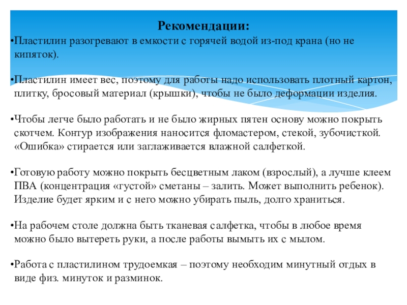Рекомендации:Пластилин разогревают в емкости с горячей водой из-под крана (но не кипяток).Пластилин имеет вес, поэтому для работы