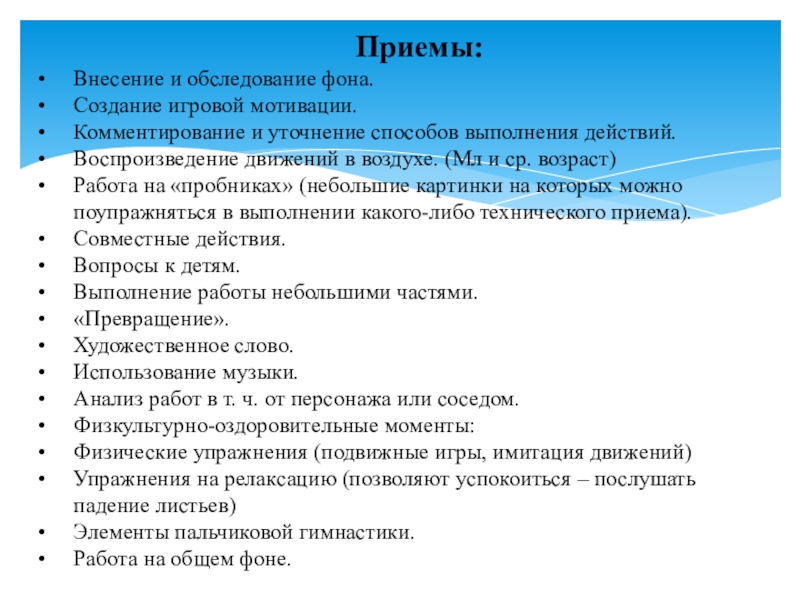 Приемы:Внесение и обследование фона.Создание игровой мотивации.Комментирование и уточнение способов выполнения действий.Воспроизведение движений в воздухе. (Мл и ср.