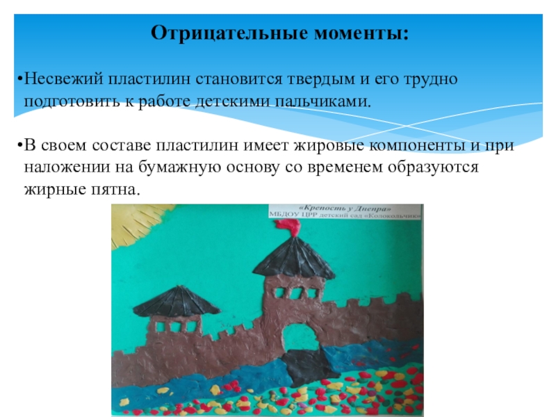 Отрицательные моменты:Несвежий пластилин становится твердым и его трудно подготовить к работе детскими пальчиками.В своем составе пластилин имеет