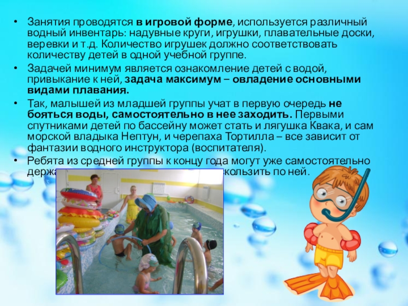 Занятия проводятся в игровой форме, используется различный водный инвентарь: надувные круги, игрушки, плавательные доски, веревки и т.д.