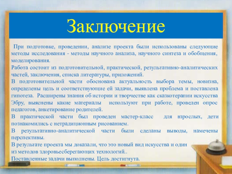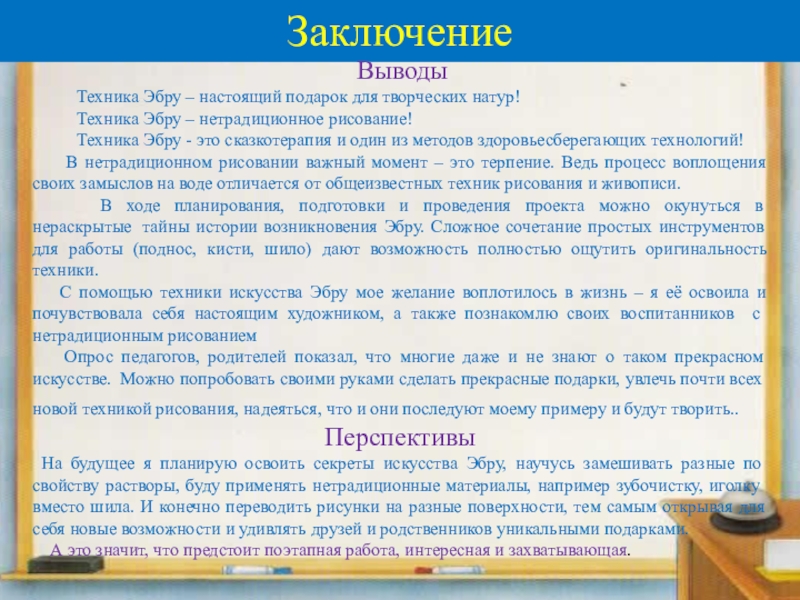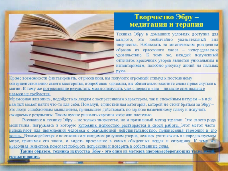 Таким образом, техника искусства Эбру - это один из методов здоровьесберегающих технологий, сказкотерапия.