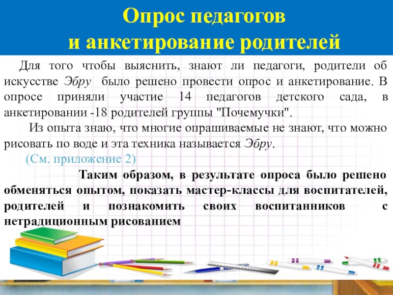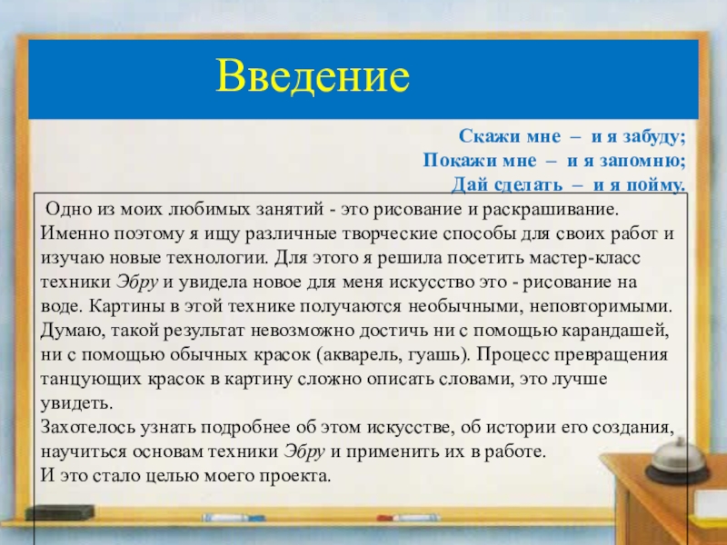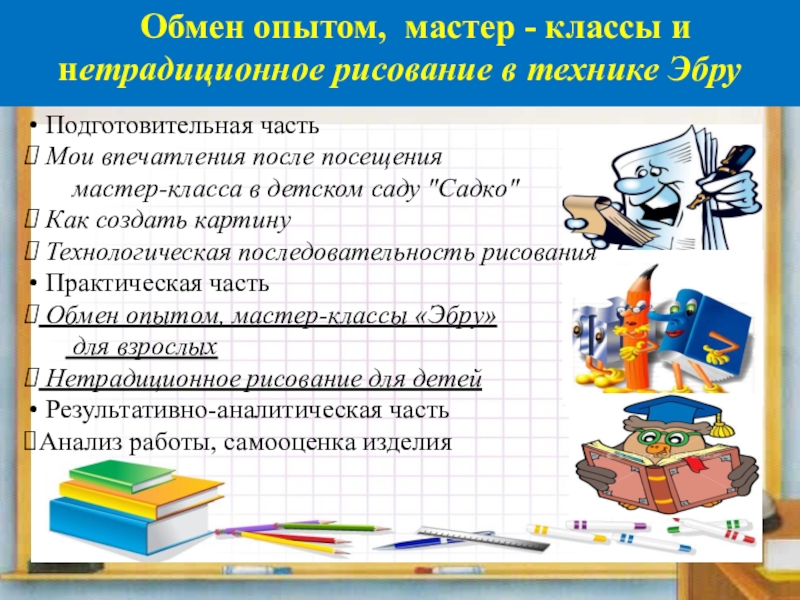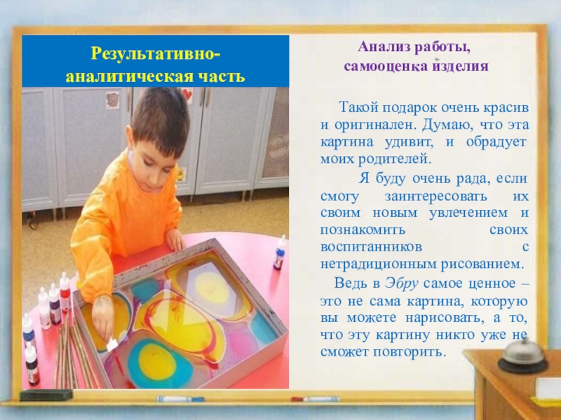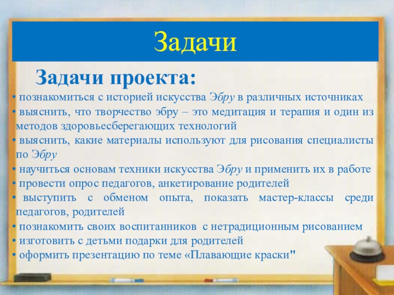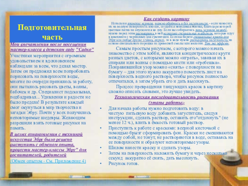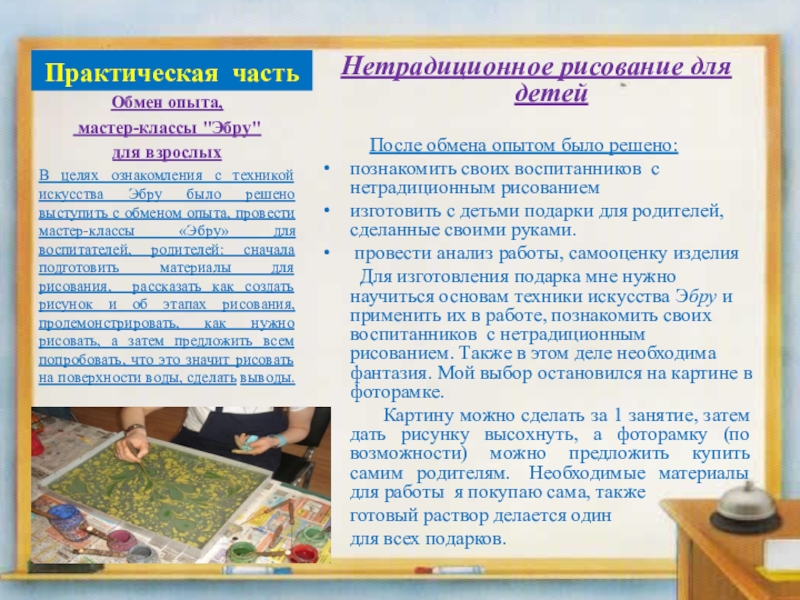 В целях ознакомления с техникой искусства Эбру было решено выступить с обменом опыта, провести мастер-классы Эбру" для воспитателей, родителей