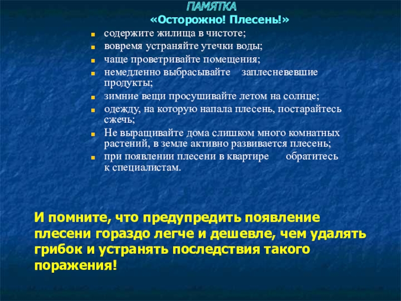 И помните, что предупредить появление плесени гораздо легче и дешевле, чем удалять грибок и устранять последствия такого поражения!