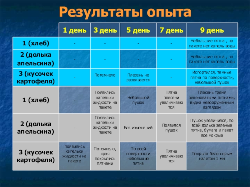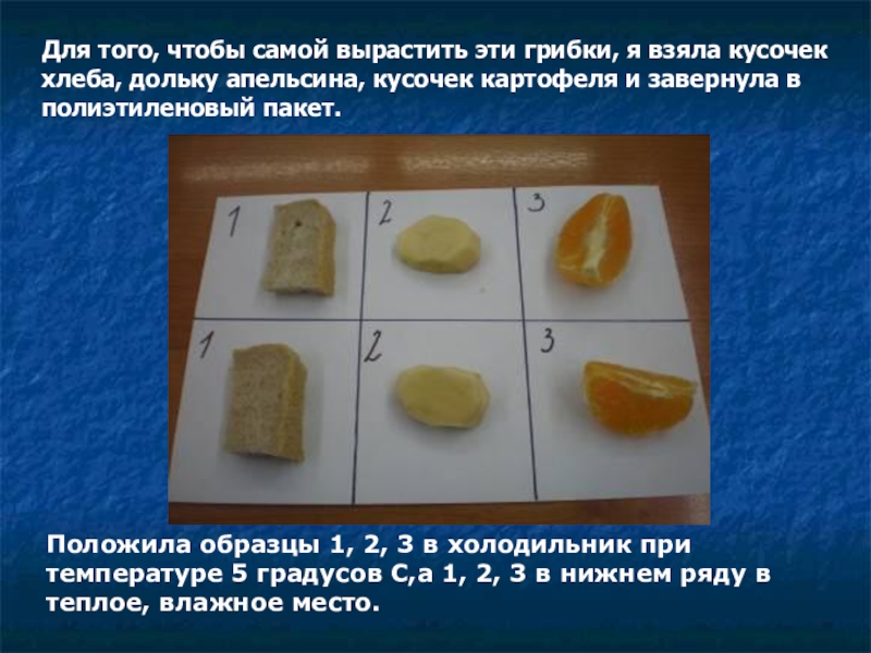 Положила образцы 1, 2, 3 в холодильник при температуре 5 градусов С,а 1, 2, 3 в нижнем ряду в теплое, влажное место.
