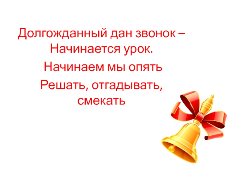 Долгожданный дан звонок – Начинается урок. Начинаем мы опять Решать, отгадывать, смекать