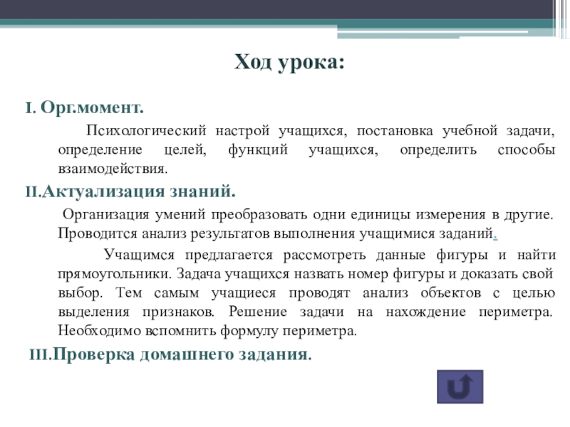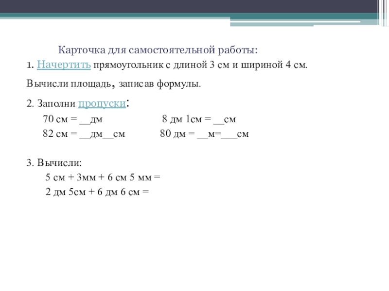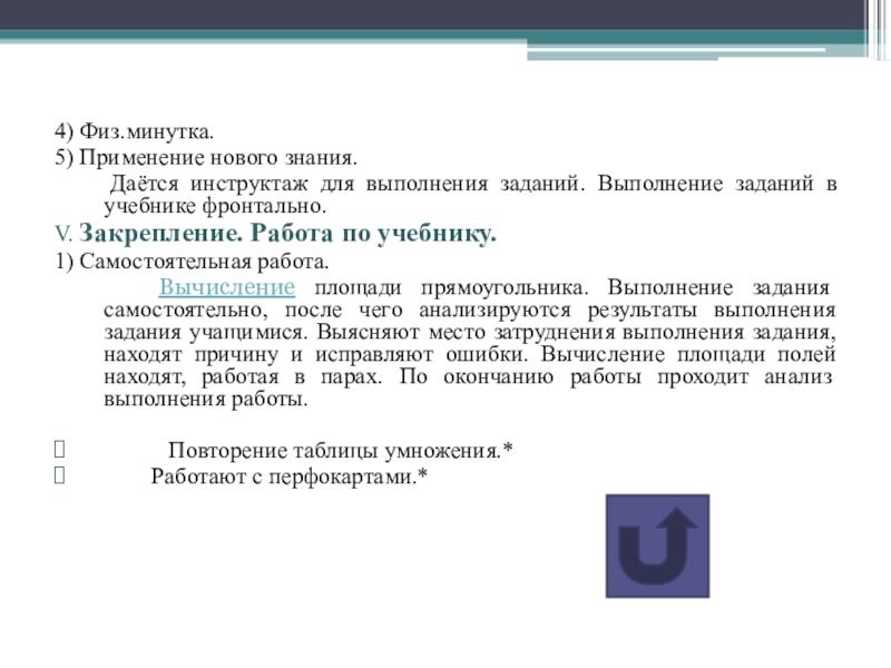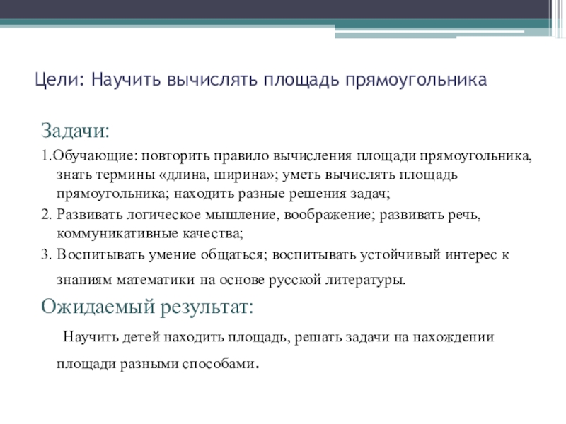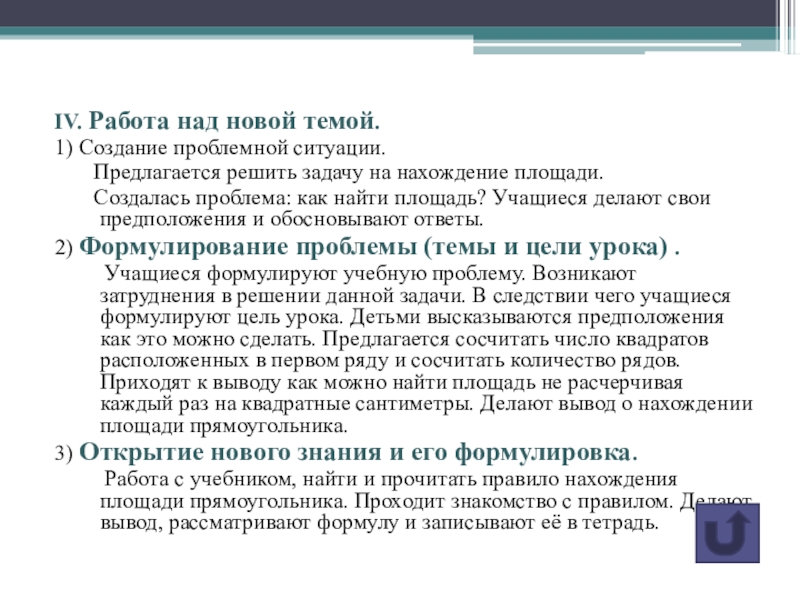 Учащиеся формулируют учебную проблему. Возникают затруднения в решении данной задачи. В следствии чего учащиеся формулируют цель урока. Детьми высказываются предположения как это можно сделать. Предлагается сосчитать число квадратов расположенных в первом ряду и сосчитать количество рядов. Приходят к выводу как можно найти площадь не расчерчивая каждый раз на квадратные сантиметры. Делают вывод о нахождении площади прямоугольника.